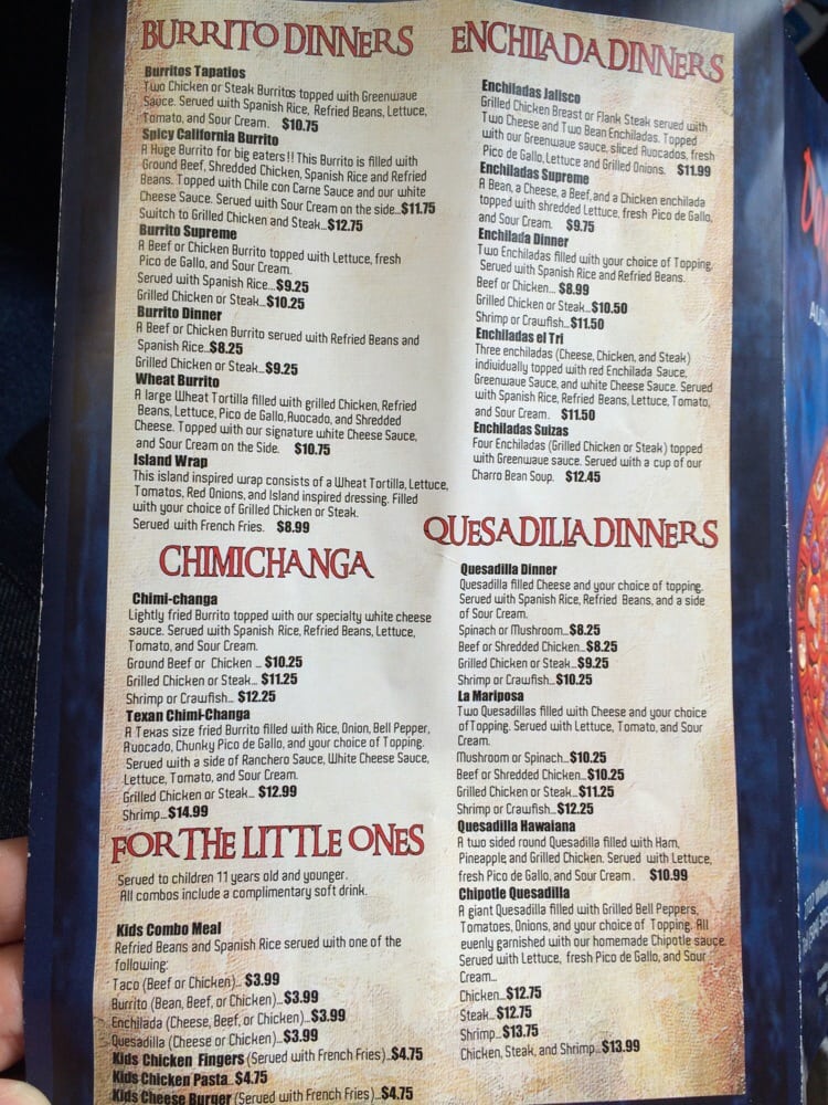 Grilled chicken breast, topped with grilled onions, pineapple, and ham. Covered with cheese sauce. Served with Spanish rice, refried beans, lettuce, fresh pico de gallo, sour cream, guacamole, and tortillas.