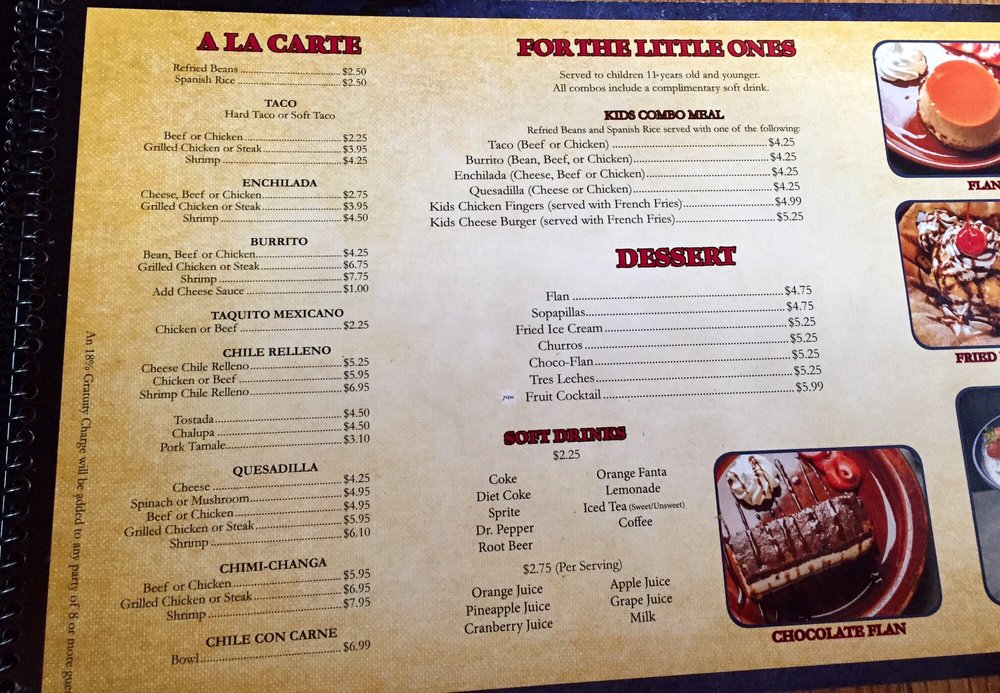 Bean chalupa, beef and bean burrito, beef taco, and beef enchilada.